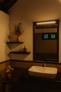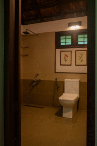 Within, you’ll find two air-conditioned rooms (Maya & Moksha), a spacious common living and dining area. The ensuite bathrooms are modern and complete, with running water, geyser, shower, WC, and basin — all designed for comfort while staying true to simplicity.