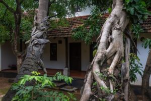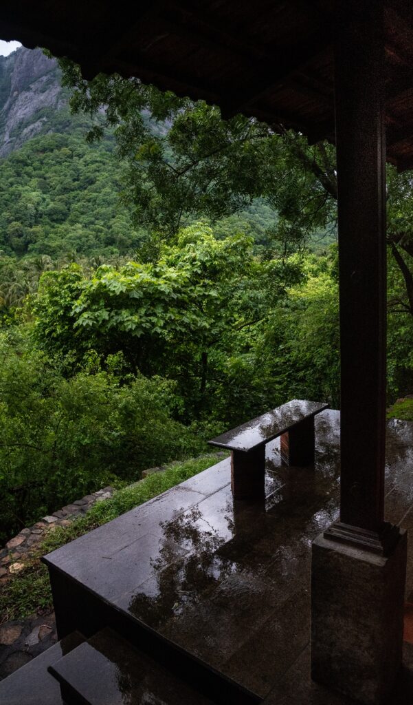 Perched on the forest’s edge in the heart of the Palghat Gap, Seethavanam’s bungalow opens out to sweeping views of the Seetharkund waterfalls and the lush countryside of Kollengode. Rooted in the traditional style of old Palakkadan homes, the structure blends seamlessly with the landscape with terracotta-tiled roofs, hand-laid terracotta floors, and seasoned palmyra wood all coming together to create a space that feels warm, grounded, and timeless.